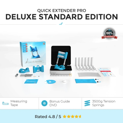 The Quick Extender Pro Deluxe Edition is a comprehensive traction system featuring powerful tension springs, extra comfort pads and rods, and the brand’s DSS support system—making it one of the most complete kits for men seeking maximum comfort and faster length-enhancement results.